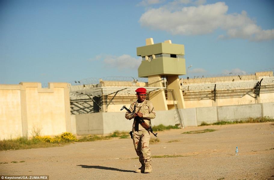 أحد أفراد الجيش الليبي يقوم بحراسة القصر شديد الحماية في مارس 2011، قبل بداية الثورة الليبية