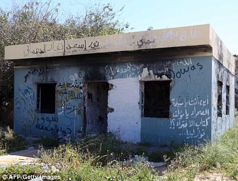 أحد المباني من ملحقات قصر العزيزية بعد تدميره وتبدو عليه رسومات وعبارات تحمل شعارات الثوار
