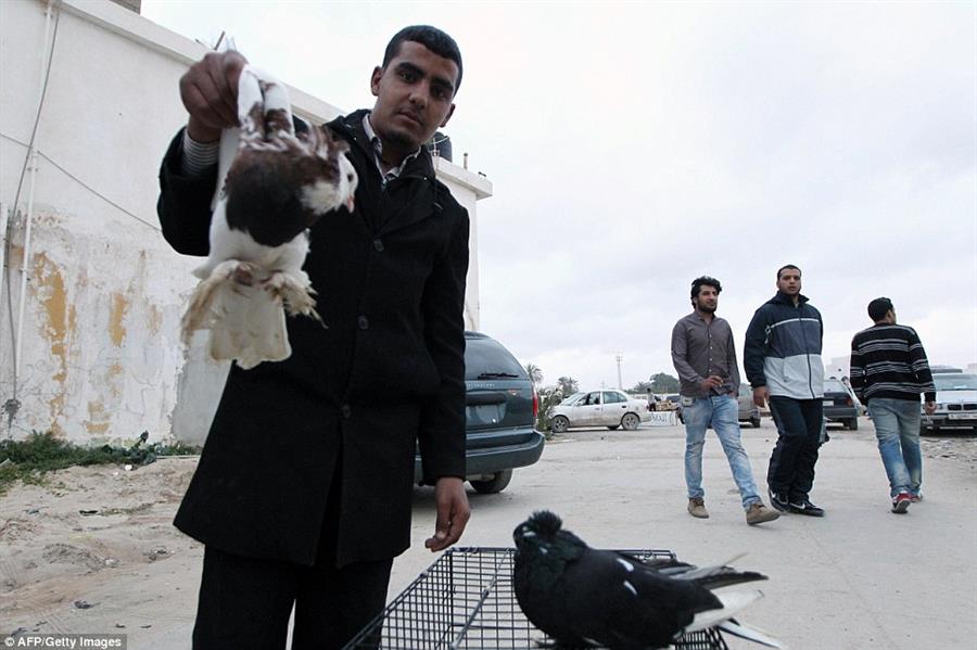 شاب ليبي يسير في موقع القصر الرئاسي في بنغازي سابقًا، ويحمل طيورًا يبيعها على الراغبين، في تحول مدهش لوضع المكان عما كان عليه من 4 سنوات