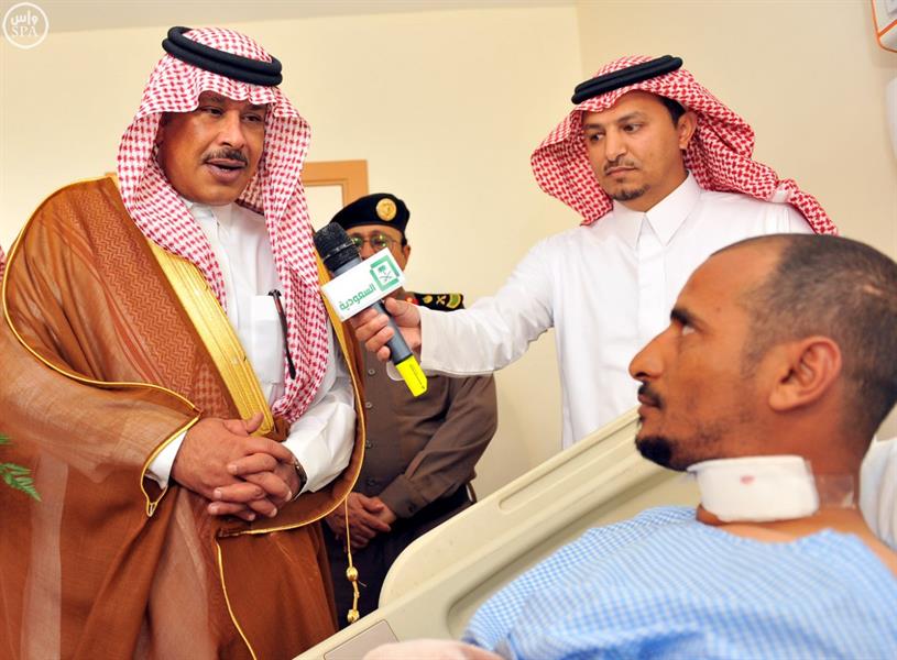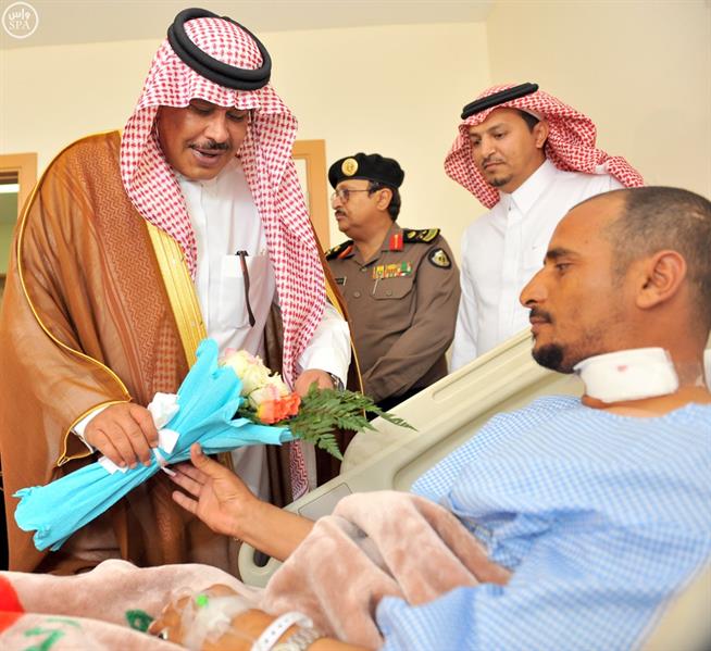 ونقل سموه للمصابين تحيات خادم الحرمين الشريفين الملك سلمان بن عبدالعزيز آل سعود، وسمو ولي عهده الأمين، وسمو ولي ولي العهد - حفظهم الله - , منوهاً بالحرص الكبير الذي يوليه صاحب السمو الملكي الأمير محمد بن سلمان بن عبدالعزيز وزير الدفاع لأفراد القوات المسلحة في جميع مناطق المملكة ، سائلا الله تعالى أن يمن عليهم بالشفاء العاجل, مثمناً ما لمسه فيهم من عزيمة واعتزاز لمواصلة تدريبهم لحماية دينهم ووطنهم ومليكهم .