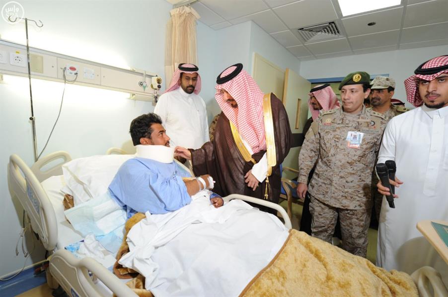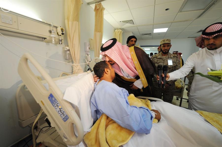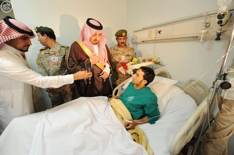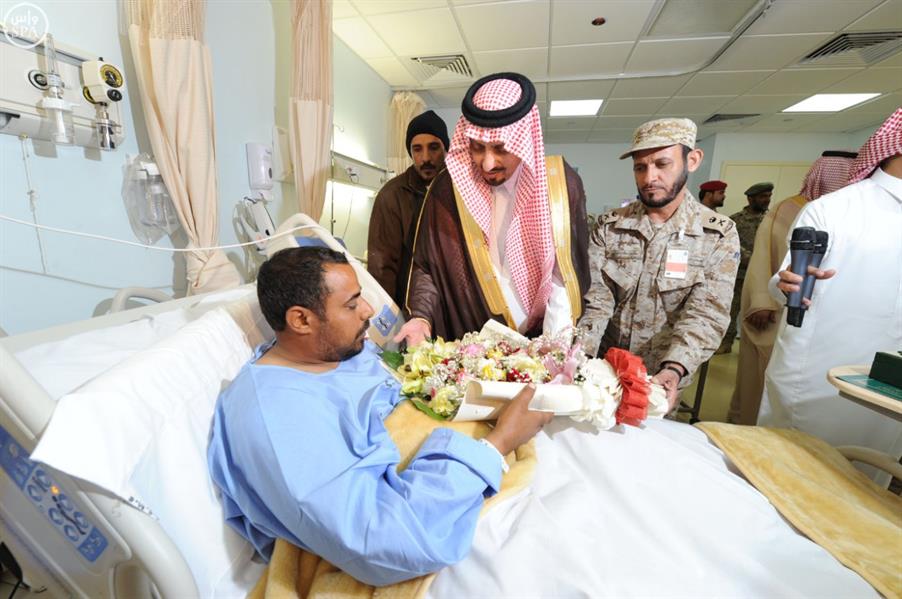 ونقل سموه للمصابين تحيات خادم الحرمين الشريفين الملك سلمان بن عبدالعزيز، وولي عهده الأمين، وولي ولي العهد، ووزير الدفاع، مثمناً مواقفهم الشجاعة في حماية الوطن، واعتزازه البالغ بما لمسه فيهم من عزيمة وإصرار لحماية دينهم ووطنهم ومليكهم.