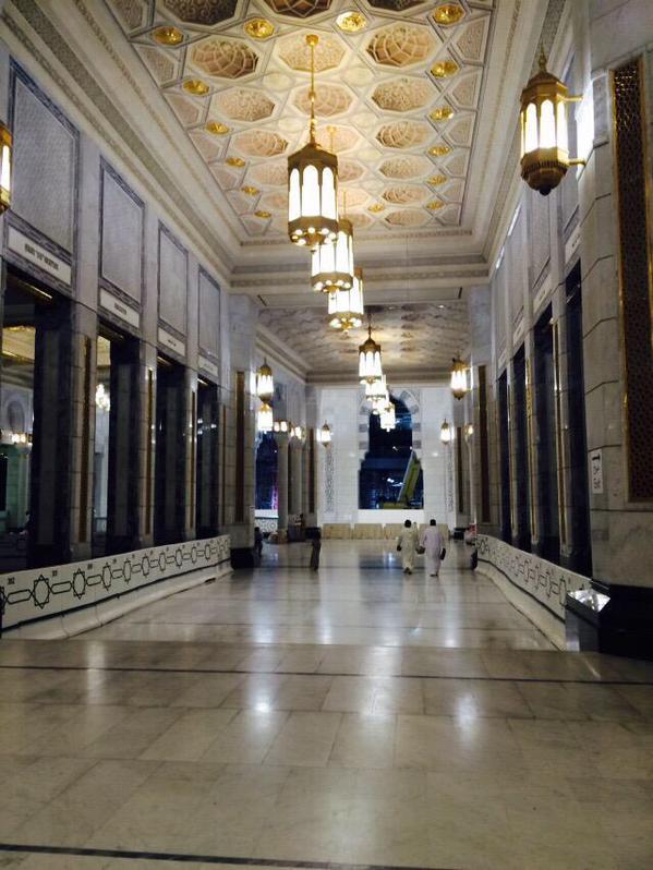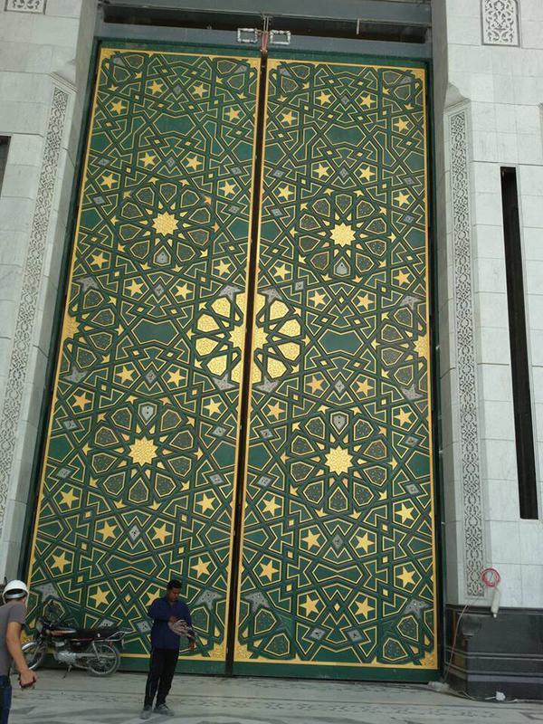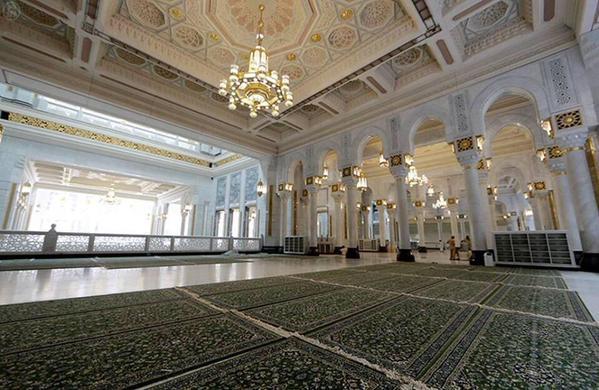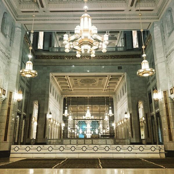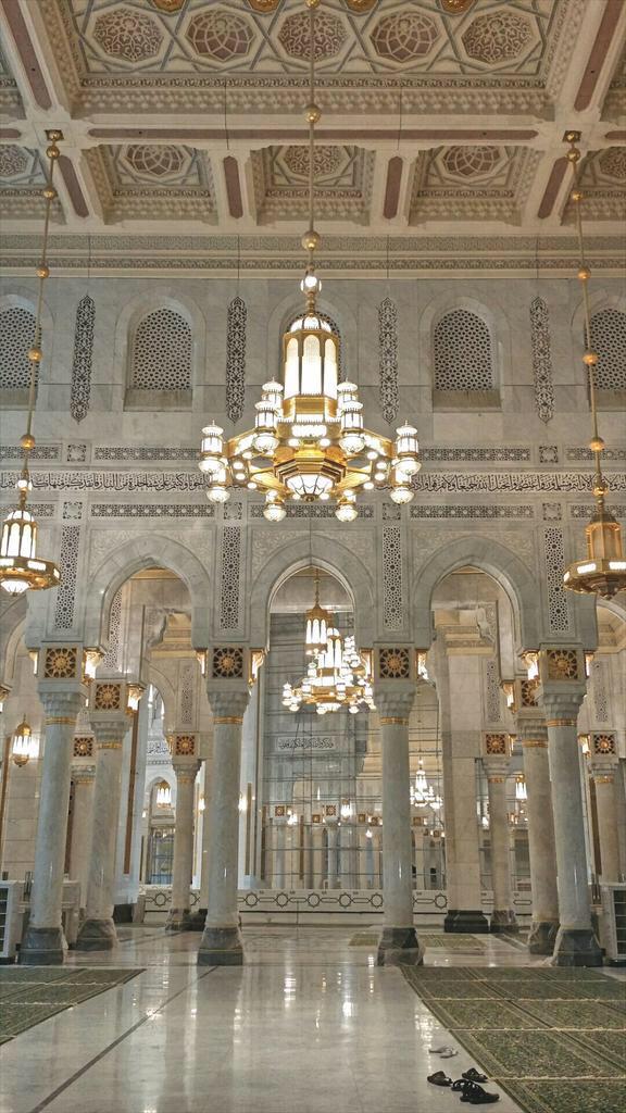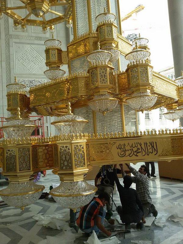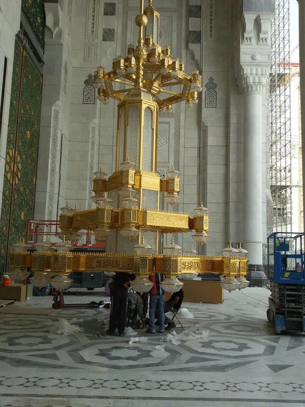 كما أظهرت صور أخرى بعض أعمال التشطيبات النهائية، منها تركيب ثريات كبيرة الحجم ذهبية اللون، لتكون متناغمة مع جمال المكان وقدسيته.