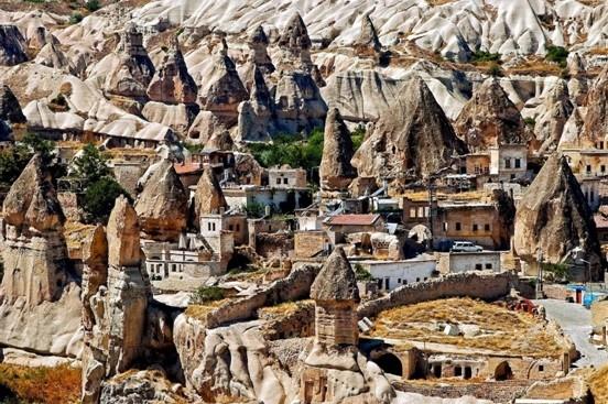 9- إقليم كبادوكيا – تركيا:- وهو إقليم تاريخي ناتج عن خليط من تدخل الإنسان والظواهر الطبيعية. ويقع كبادوكيا في شرق هضبة الأناضول، في وسط تركيا, وقد تدخل الإنسان لصنع مجموعة من الكهوف الرائعة داخل هذا الإقليم منذ ما يقرب من 3500 عام. وقد تم إنشاء العديد من المنازل والفنادق السياحية على هذه الكهوف.