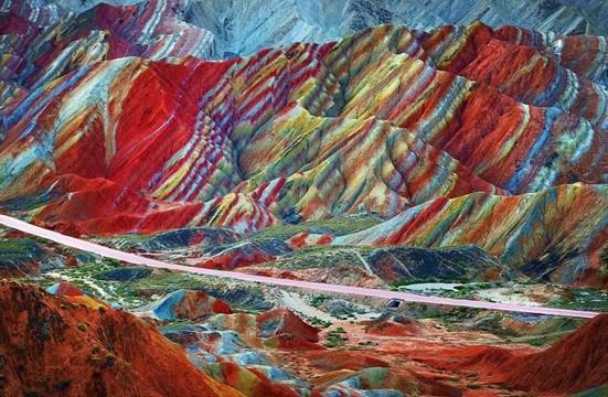 4- جبال زانجيا – الصين:- تقع هذه الجبال في إقليم جانزو بشمال وسط الصين, على مساحة 400 كيلومتر مربع، وتتألف من مجموعة من الأحجار الرملية والصخور التي يعود تكوينها للعصر الطباشيري منذ 66 مليون سنة. ويعتقد الجيولوجيون أن هذه الجبال هي نتيجة لحركة القشرة الأرضية, والتي نتج عنها تلك الصخور بمختلف أشكالها وألوانها.