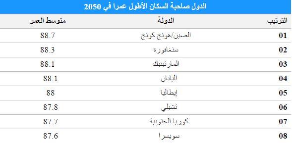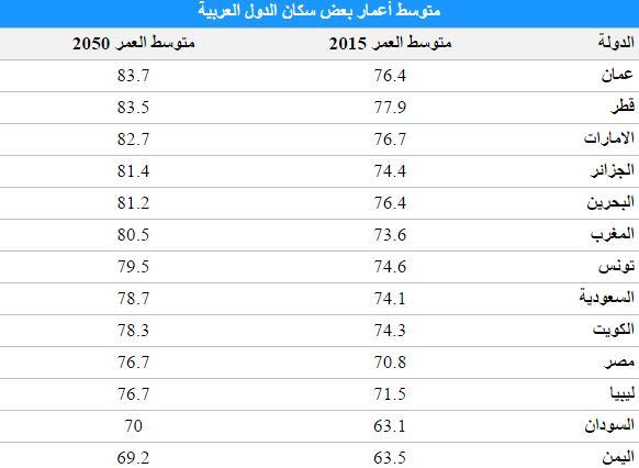 أما عن متوسط أعمار شعوب الدول العربية فمن المتوقع أن ترتفع خلال العقود القليلة المقبلة، ومن المتوقع أن تصبح شعوب عمان وقطر والإمارات من بين أطول شعوب البلاد العربية عمرا بحلول عام 2050.