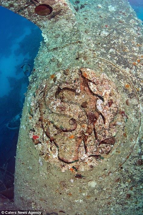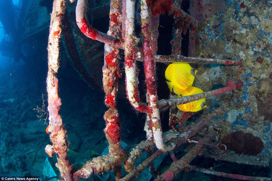 12- بعض اجزاء السفينة الغارقة تحتفظ بلونها الأحمر وسط الاسماك الملونة