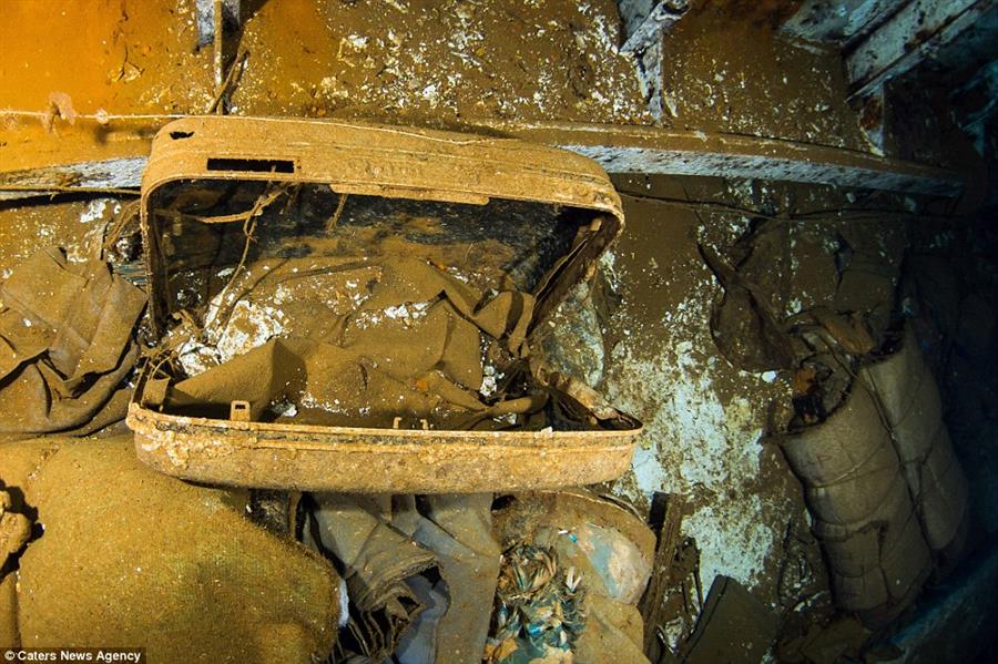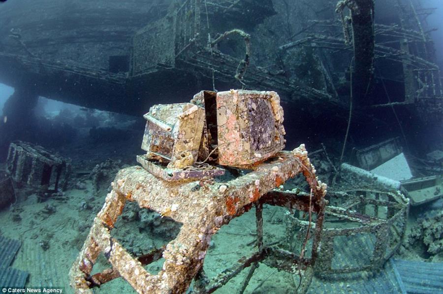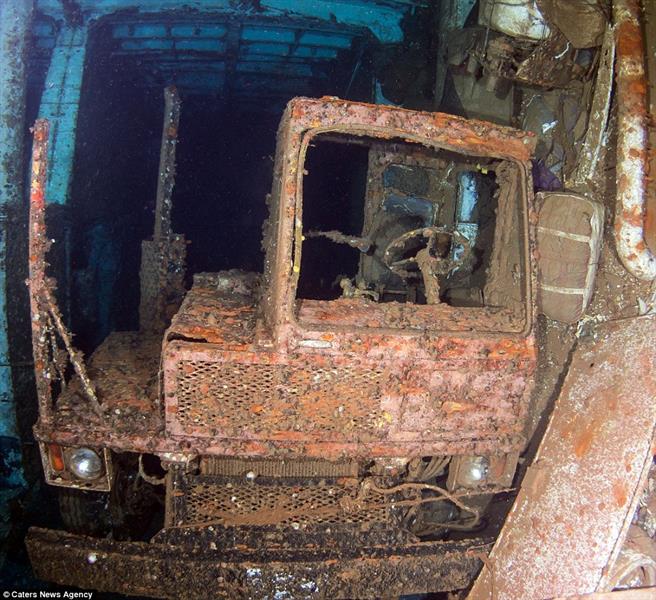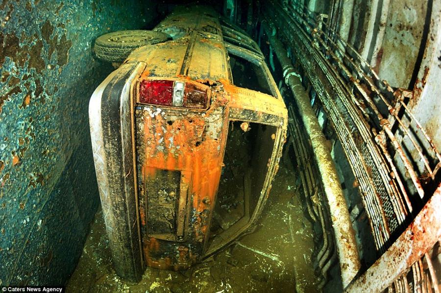 7- السيارة على اليمين حافظت على بعض من الطلاء الأحمر، في حين يبدو الصدأ وقد أتلف جسم السيارة التي كانت على متن السفينة المنكوبة