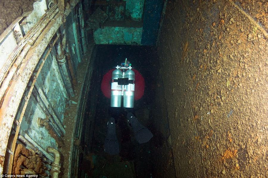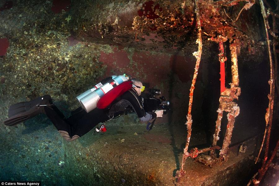 15- أحد الغواصين يتجول داخل حطام السفينة التي يبلغ طولها 100 متر