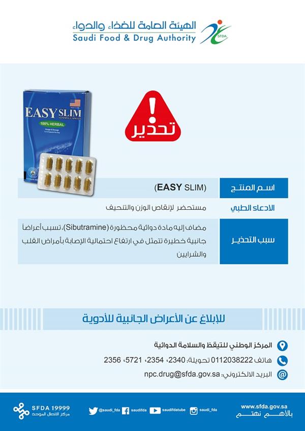 حذرت الهيئة العامة للغذاء والدواء جميع المستهلكين، من مستحضر على شكل كبسولات يحمل اسم (EASY Slim)، تسوقه محال عطارة وبعض الباعة المتجولين ومواقع التواصل الاجتماعي، على أنه مستحضر طبيعي لإنقاص الوزن والتنحيف، مؤكدةً أن هذا الادعاء مضلل وليس له أي أساس من الصحة.