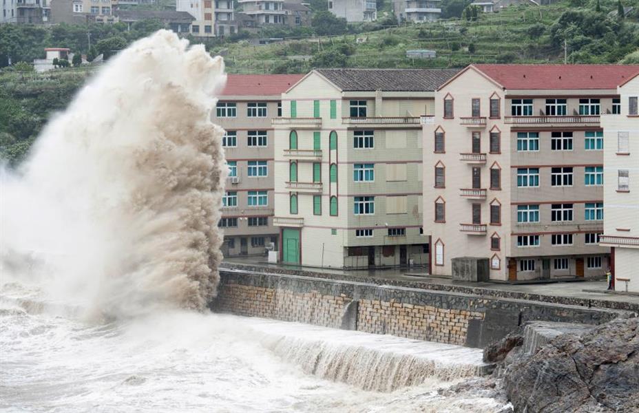 موجة ضخمة نتجت عن اعصار "تشان هوم"، تضرب الشاطئ بجوار المباني السكنية في نلينغ بمقاطعة تشجيانغ.