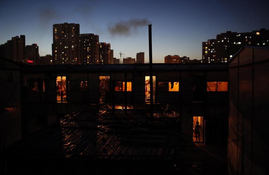 فتاة من المهاجرات، تعمل في مجال البناء، تبدو وهي في سكن العمال بالقرب من مجمعات سكنية حديثة البناء في شانغهاي.
