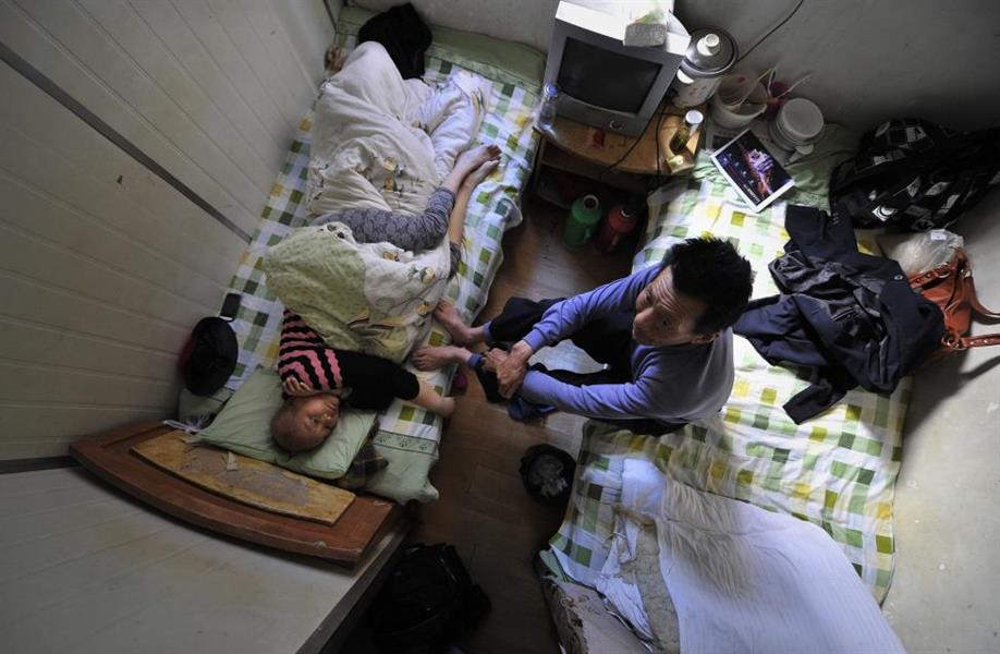 أب يجلس بجوار ابنته بعد تلقيها العلاج الكيميائي، في شقة مستأجرة مساحتها 8 أمتار مربعة، بالقرب من مستشفى في مدينة هيفي بمقاطعة انهوى، ومنذ سنوات، يشكل المرضى، الذين لا يستطيعون تحمل الإقامة في مستشفى قريب أو العثور على غرف فيها، مصدر دخل للفنادق الصغيرة القريبة من المستشفى.
