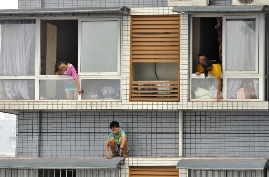 صبي يبلغ من العمر 12 عامًا يجلس خارج نافذة شقة أسرته، في الطابق الـ 11 ، بينما يحاول أقاربه أن يعيدوه الى الداخل، في مدينة ييبين بمقاطعة سيتشوان.