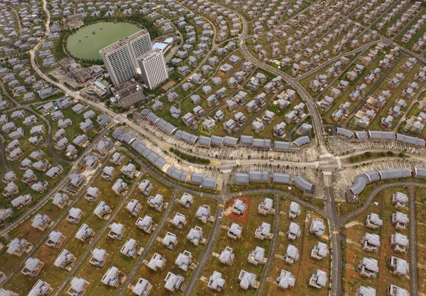 لقطة تظهر عددا كبيرا من المباني تحت الإنشاء وسط الضباب، في محافظة ريتشاو، شاندونغ.