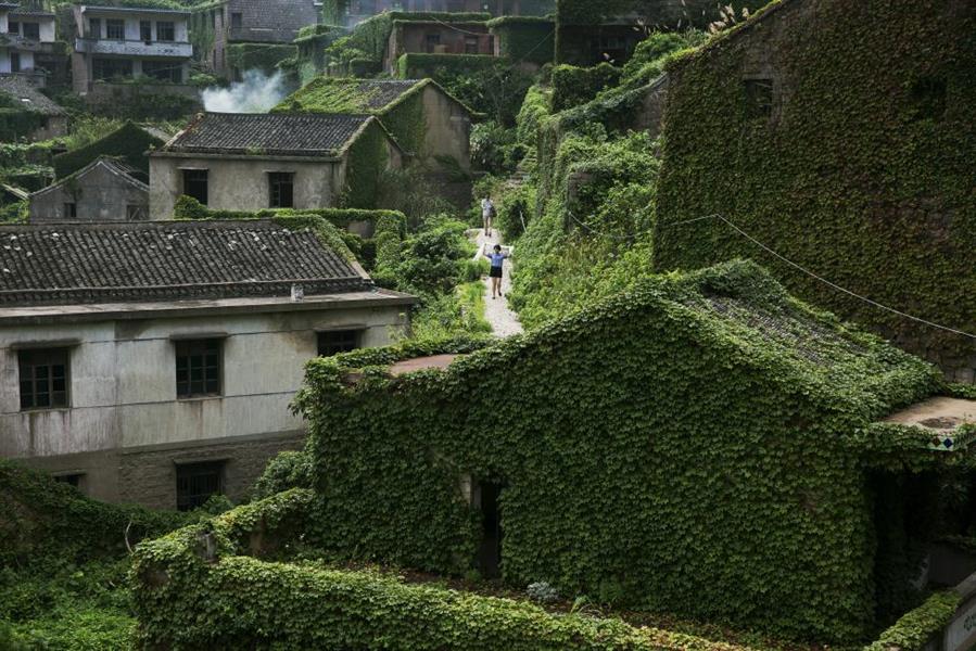 عدد من السياح وهم يسيرون بين المباني المغطاة بالكروم في قرية هاوتووان المهجورة والتي كانت تشتهر بالصيد وتقع في جزيرة شنغ شان شرق شنغهاي، وما زال عدد قليل من السكان يقطن تلك القرية، التي كانت سابقًا مأوى لأكثر من 2000 صياد.