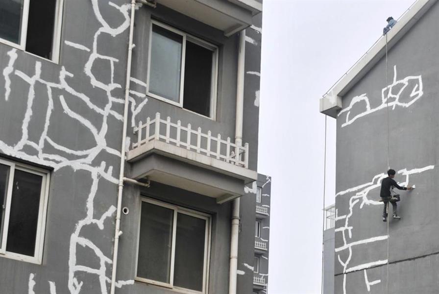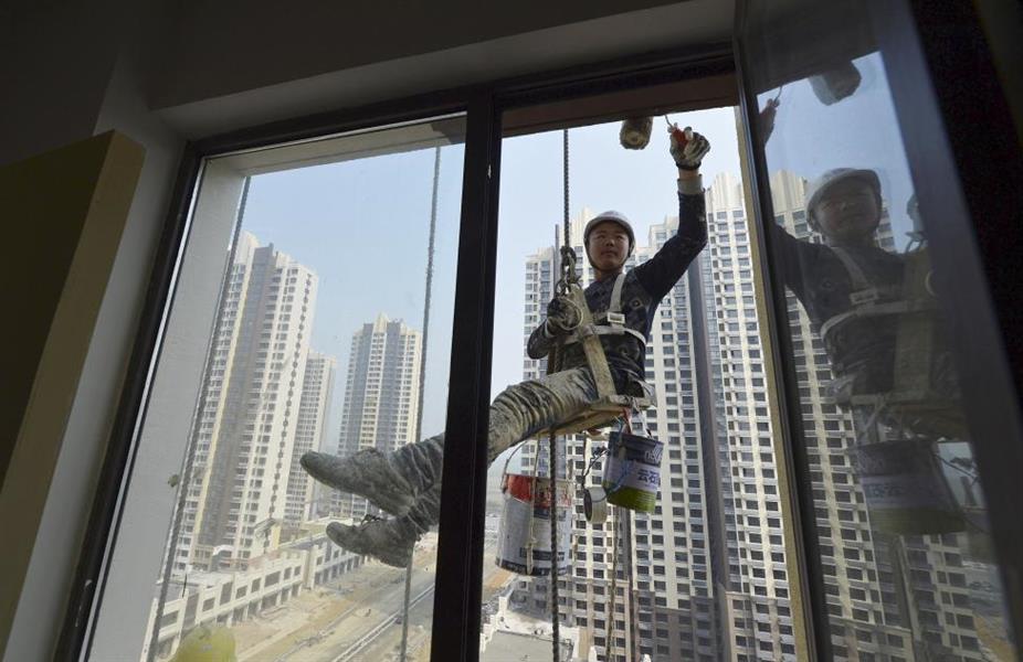 عامل دهانات يطلي الجدران بمادة مقاومة للماء في مبنى سكني بمدينة تشانغتشو في مقاطعة جيانغسو.