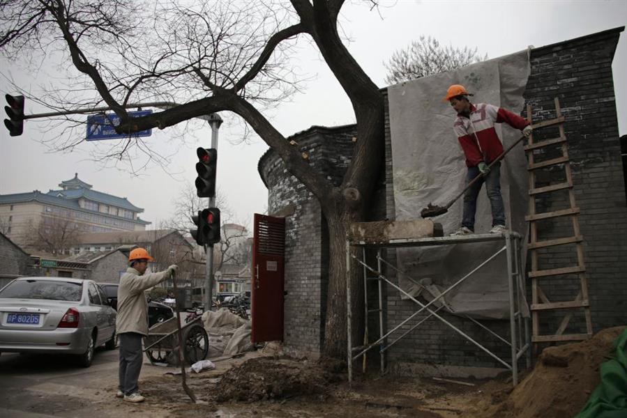 عمال يجهزون الاسمنت لترميم مبنى قديم يقع في حارة صغيرة وسط بكين.