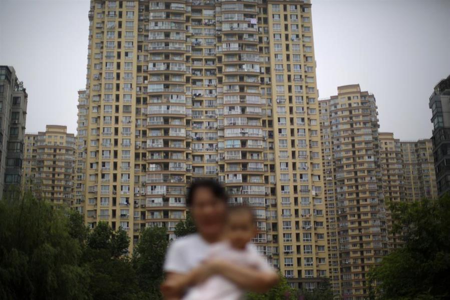امرأة صينية تحمل ابنها في إحدى الساحات في منطقة سكنية في شنغهاي