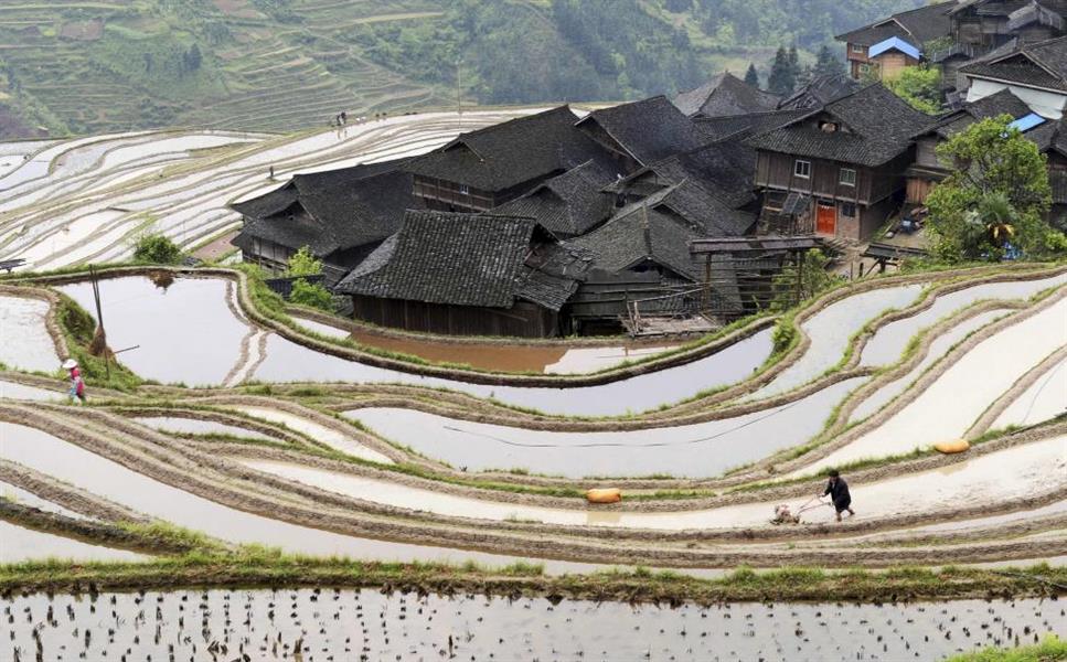 مزارع يحرث حقله لزراعة الحبوب في مزرعة مدرجة بمقاطعة قويتشو.