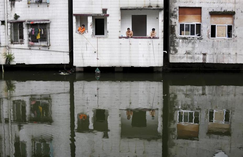 مواطنون يقومون بالصيد من نافذة شقة مهجورة في أحد الأحياء الفقيرة وسط مدينة قوانغتشو