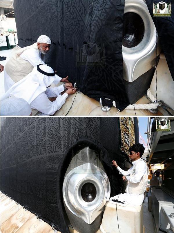 كسوة الكعبة المشرفة وقد تم إسدال الجزء الذي تم رفعه منها خلال أيام موسم الحج المبارك لعام 1436هـ وتثبيته بحلق الشاذروان المثبتة بالكعبة، حيث يرفع هذا الجزء عند كسوتها قبل الحج ويبقى مرفوعاً حتى مغادرة الحجاج.