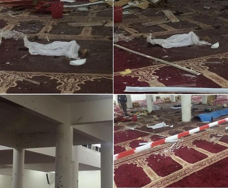 صور من داخل مسجد "المشهد" بنجران في أعقاب التفجير الآثم الذي استهدفه حيث تظهر حجم الخسائر والدمار الذي طال المسجد، حيث تبعثرت محتوياته وأُتلفت أرضيته وتحطمت نوافذه وتناثرت الدماء على جدرانه.
