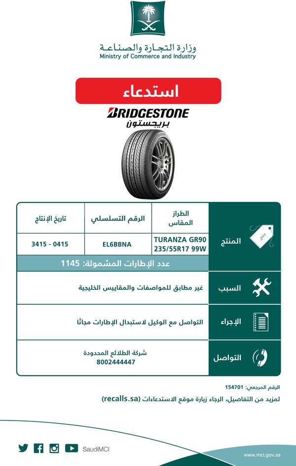 ودعت الوزارة عبر حسابها بموقع "تويتر"، أصحاب الإطارات من طراز "Turanza GR90" مقاس (235 R17 99W/55)، للتواصل مع الوكيل لاستبدالها مجاناً.