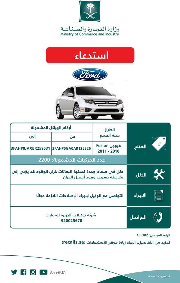 أعلنت وزارة التجارة والصناعة، اليوم الخميس، استدعاء 3128 سيارة من طراز فورد فيوجن، وميركوري ميلان، لوجود خلل في خزان الوقود.