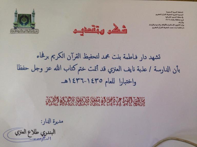 صورة الشهادة التي حصلت عليها سيدة في العقد السادس من عمرها بعد حفظ القران الكريم كاملاً، في 3 سنوات بإصرار وهمه عالية، بعد التحاقها بدروس محو الأمية، حيث كانت تجهل القراءة والكتابة سابقًا، كما أنها لم تخبر أولادها بحفظها للقران.