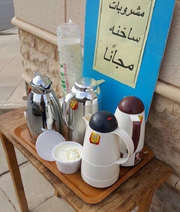 مشروبات ساخنة، وفرتها إحدى الأسر مساعدة للمارة على مواجهة الطقس البارد الذي تمر به مدينة الرياض، بجوار منزلها في حي القدس مع لافتة تدعو المارة لتناول المشروبات الساخنة مجانًا، ولقيت الفكرة إشادة كبيرة على مواقع التواصل.