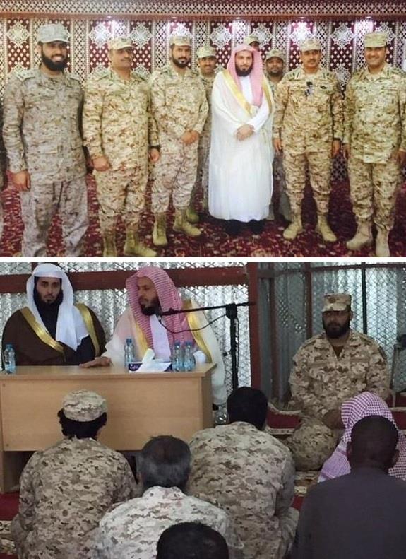 إمام الحرم المكي الشيخ صالح آل طالب أثناء زيارة جنود الحرس الوطني المرابطين على الحد الجنوبي، دعمًا لهم وتأكيدا على ضرورة مؤازرتهم، مبينًا أن مسؤولية الجميع، بمن فيهم الأئمة والخطباء، تتعاظم في مثل هذه الظروف.