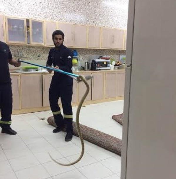 صورة لرجال الدفاع المدني في بيشة يمسكون ثعبانًا ضخمًا باغت عائلة بأحد أحياء المحافظة وتفاجأت بوجوده داخل مطبخ منزلهم، حيث تم إخراج الثعبان من المنزل دون وقوع أي إصابات.