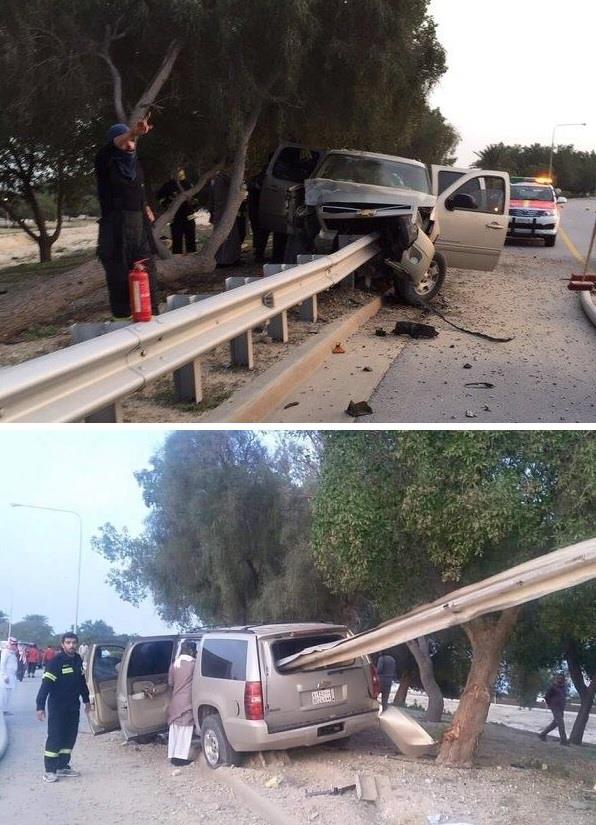 صورة لسيارة من نوع “تاهو” نجا صاحبها من موت محقق، بعد أن اصطدمت بسياج على جانب طريق شاطئ النخيل بالجبيل الصناعية، واخترق السياج الحديدي السيارة من الأمام وخرج عبر زجاجها الخلفي، في حادث وقع بسبب انشغال السائق بهاتفه الجوال.