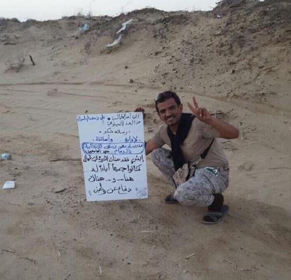 رسالة مكتوبة على لوحة بعثها الجندي محمد الشمراني المرابط بالحد الجنوبي، لمعلمي مدرسة سعود بن نايف بالدمام، التي يدرس بها ابنه، معبراً خلالها عن شكره لهم، للرعاية والاهتمام بابنه الذي غاب عنه بسبب المرابطة.