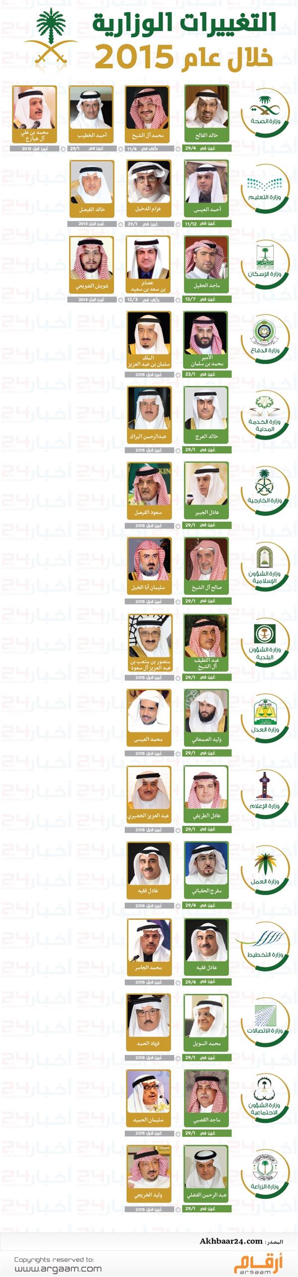 تمت خلال العام المنصرم (2015) تغييرات عديدة على عدد من الوزارات؛ إذ عُيّن وزراء جدد، و أُعفي آخرون، وطالت تلك التغييرات 15 حقيبة وزارية.