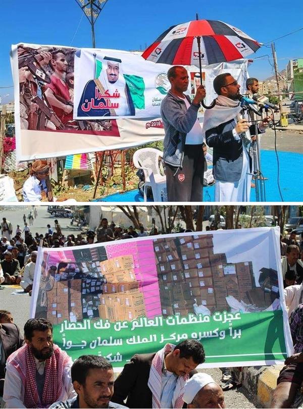 صور أهالي تعز باليمن، يعبرون عن شكرهم لخادم الحرمين الشريفين الملك سلمان بن عبدالعزيز، ولمركز الملك سلمان للإغاثة والأعمال الإنسانية، وذلك بعد كسر الحصار المفروض على المحافظة وإنزال المواد الإغاثية والمساعدات الطبية والأدوية لهم.