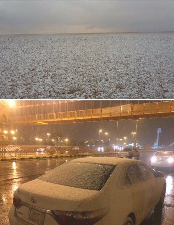 الثلوج تكسو مدينة عرعر والأطراف الشمالية للمملكة، بعد أن شهدت المناطق الشمالية طقساً شديد البرودة، وسقطت الأمطار على الحدود الشمالية والجوف وحائل، والثلوج على عرعر وسكاكا.