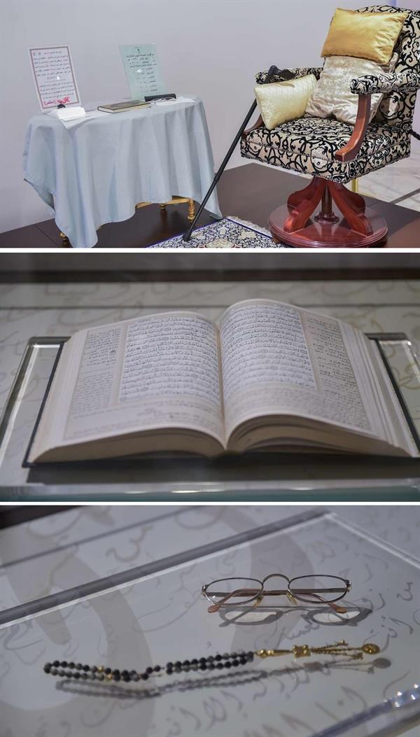 صور لأبرز مقتنيات الملك الراحل عبدالله بن عبدالعزيز ومنها القرآن الكريم، وسجادة للصلاة، ومسبحة، ونظارة للقراءة، وبعض أوراق الأدعية، والأذكار اليومية، وعصا للاتكاء، ومواقيت الصلاة، عرضتها مؤسسة الملك عبدالله الإنسانية العالمية.