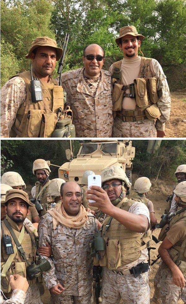 الإعلامي وليد الفراج مرتديًا الزي العسكري برفقه الجنود على الحد الجنوبي، مؤكداً أن ما رآه يدعو للفخر من تجهيزات وتدريب، ومؤكداً أن الجيش السعودي مستمتع بكتابه تاريخ جديد لسيف هذا البلد.