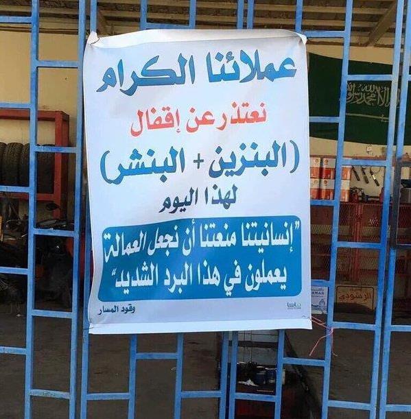لوحة معلقة على محطة وقود تعتذر لعدم العمل جراء البرد القارس، معللة ذلك بعبارة "إنسانيتنا تمنعنا"، حيث قال ملاك المحطة إن إنسانيتهم منعتهم من جعل العمالة يمارسون عملهم في هذا الجو شديد البرودة.