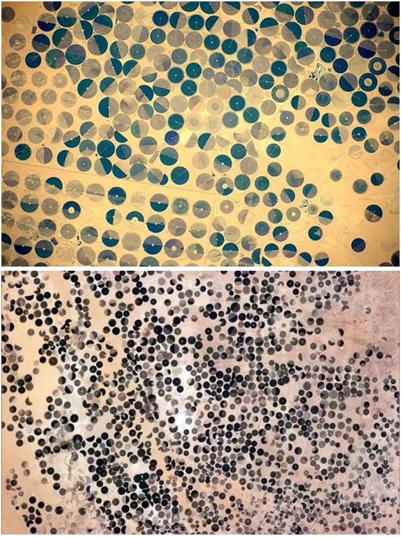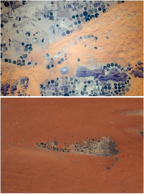 ولأن الصحراء أكثر ما يميز شبه الجزيرة العربية، فقد أبدى كثير من رواد الفضاء دهشتهم من حقول المزارع الدائرية المنتشرة. رائد الفضاء أليكساندر جيرست يتساءل بدهشة: "من أين يأتون بالماء ليزرعوا هنا؟". الصورتان من منطقة حول وادي الدواسر.