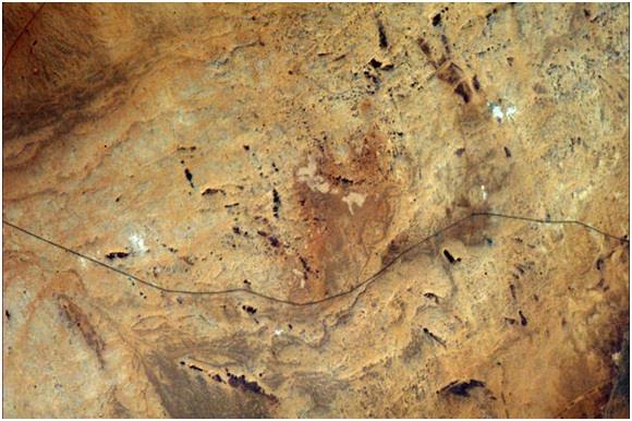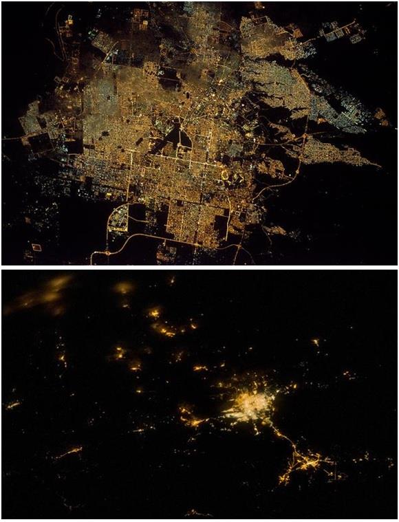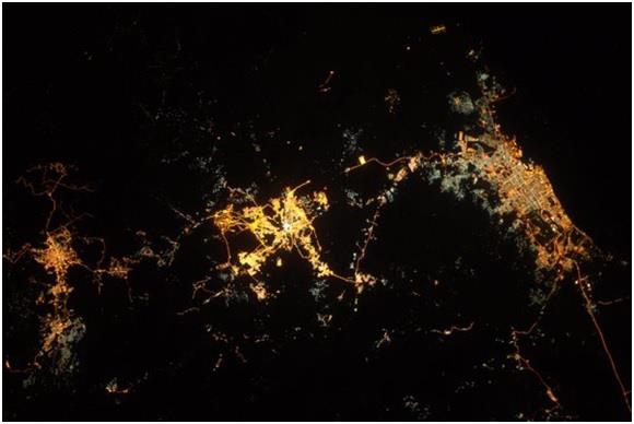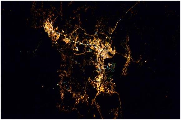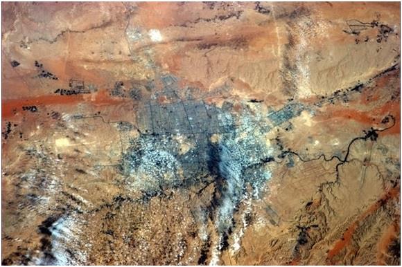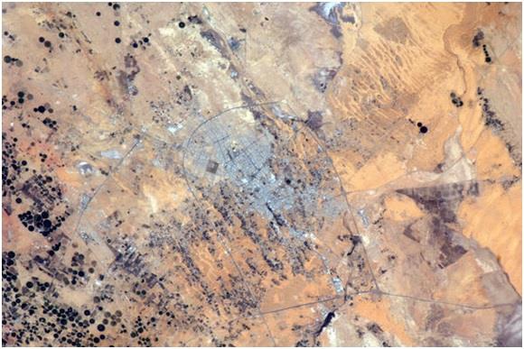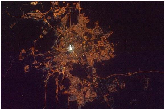 الرياض، مرة أخرى.. رائد الفضاء كريس هادفيلد – الذي التقط الصورة – كتب متعجبا: "بقعة الرماد البشرية هذه تقاوم هنا وسط هذه الصحراء القاحلة"
