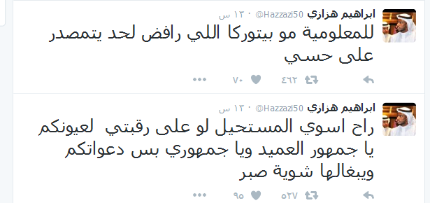 وقال هزازي عبر حسابه الشخصي على موقع “تويتر”: “راح أسوي المستحيل لو على رقبتي لعيونكم يا جمهور العميد ويا جمهوري؛ بس دعواتكم ويبغالها شوية صبر”؛ مضيفاً: “للمعلومية ليس بيتوركا اللي رافض عودتي، لا حد يتمصدر على حسي”.