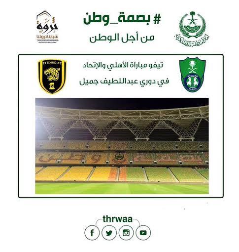 ووفقاً للإمارة فستتزين مدرجات مباراة الأهلي والاتحاد، اليوم بتيفو حملة (بصمة وطن) بالتنسيق مع رابطة مشجعي الناديين.