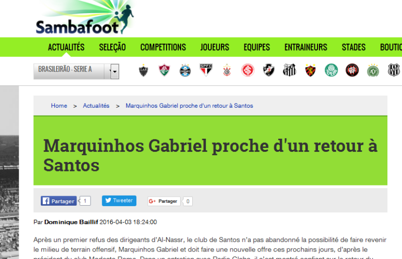 وقالت صحيفة “sambafoot” :” غابرييل ماركينيوس يقترب من العودة إلى سانتوس، بعد رفض النصر للعرض الأول،وسيتم التقدم بعرض جديد خلال الأيام المقبلة بحسب ما ذكره رئيس سانتوس موديستو روما في مقابلة مع راديو جلوبو؛ حيث أكد موديستو ثقته في عودة ماركينيوس في النصف الثاني من منافسات الموسم الجاري “.