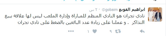 وغرّد “القوبع” عبر حسابه الشخصي على موقع تويتر: “نادي نجران هو النادي المنظم للمباراة، وإدارة الملعب ليس لها علاقة ببيع التذاكر.. عملنا على زيادة عدد البائعين بالضغط على نادي نجران”.