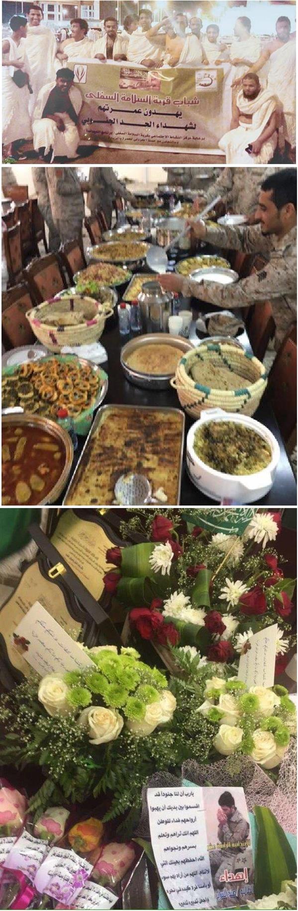 صور لـ 30 شابًا من منطقة جازان، أثناء أداء العمرة عن شهداء الحد الجنوبي، هدية منهم للشهداء، وأخرى لوجبة غداء ودروعاً تذكارية أهدتها منسوبات مدرسة ابتدائية بمحافظة طريف بالحدود الشمالية، لرجال القوات البرية بالمحافظة، تقديراً منهن لهم واستشعاراً بما يقدمونه لحماية الوطن.