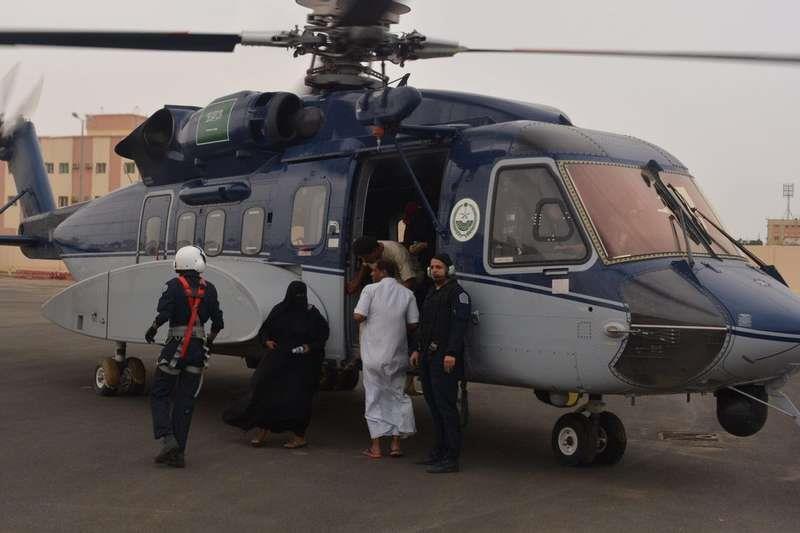 صورة طائرة تابعة للأمن وهي تنقذ إحدى العائلات المحتجزة وسط مياه الأمطار والسيول بقرية الوجه الحسن بمحافظة صبيا بمنطقة جازان.