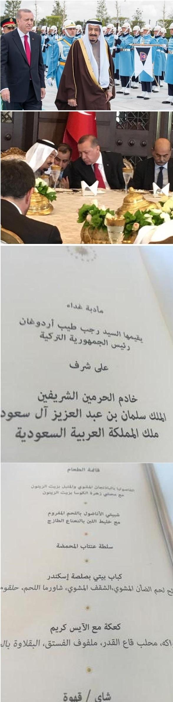 صور لزيارة خادم الحرمين الشريفين الملك سلمان بن عبدالعزيز لتركيا حيث استقبله الرئيس رجب طيب أردوغان، وقلده وسام الجمهورية التركية، كما أقام الرئيس أردوغان لخادم الحرمين مأدبة غداء تكريمًا له تضمنت كباب بصلصة إسكندر، وشرائح لحم الضأن المشوي، والشاورما والآيس كريم.