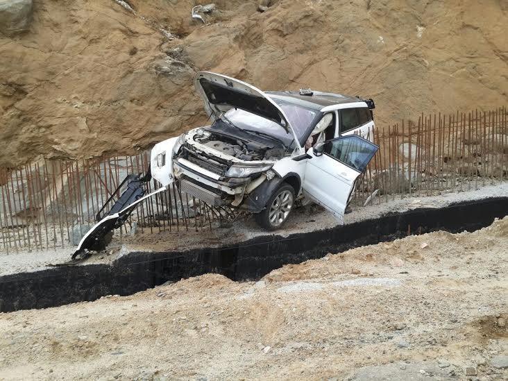 صورة لسيارة "رينج روفر" سقطت من مرتفع جبلي أثناء توقف قائدها لالتقاط الصور، ونسيانه تأمينها بالمكابح، ما تسبب بتلفيات كبيرة في السيارة، دون وقوع إصابات.
